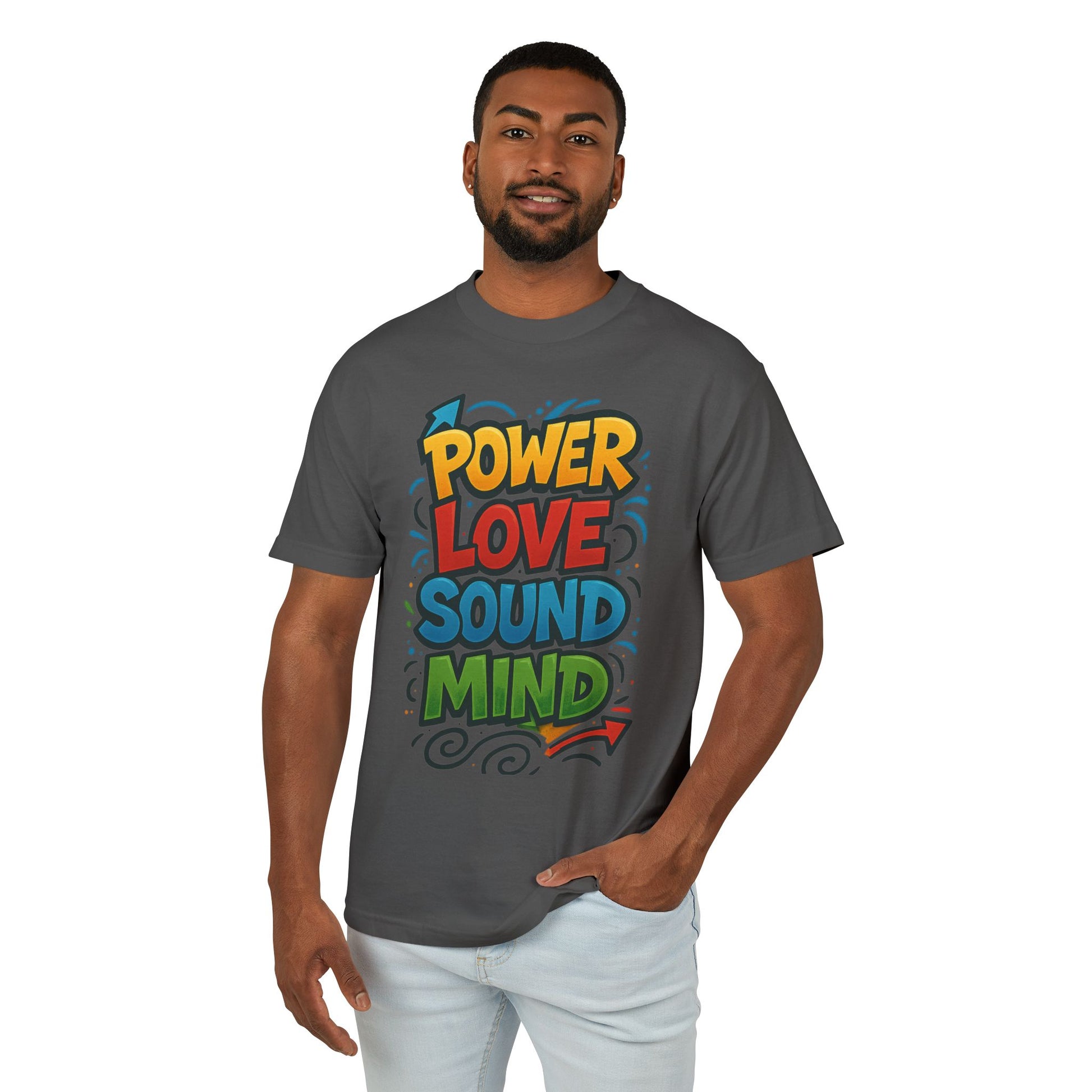 Bright, bold, and unapologetically joyful—this Custom Designed, heavyweight cotton tee wears its message on the chest. Hand-printed style lettering stacks the words POWER, LOVE, SOUND, MIND in vibrant, graffiti-inspired colors that pop against a vintage garment-dyed background. The relaxed fit and sturdy 6 oz fabric give it a lived-in feel from the first wear, while reinforced shoulder and neck taping keeps the silhouette steady wash after wash. It’s the kind of shirt you reach for when you want to make a playful statement and feel grounded at the same time: lively on the outside, comfortable and reliable on the inside.